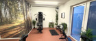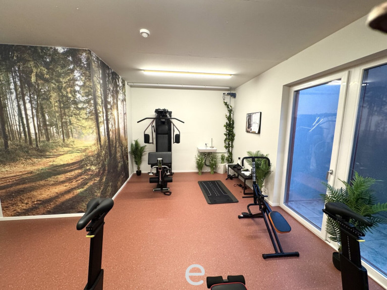 Moderner Fitnessraum mit Geräten und Freiluftterrasse