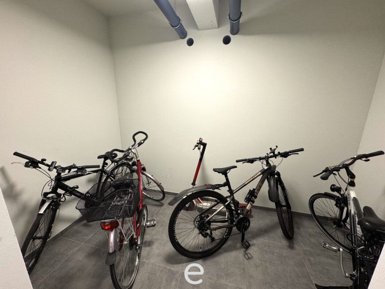 Großzügiges Kellerabteil, Fahrrad- und Kinderwagenraum und begrünter Garten mit Kinderspielplatz