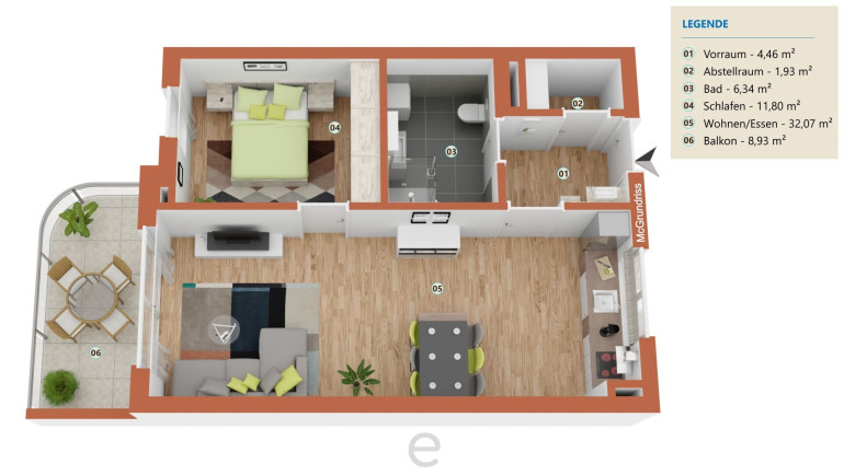 Das Herzstück bildet der großzügige Wohn- und Essbereich mit offen integrierter, hochwertiger Einbauküche – ein Ort zum Ankommen und Wohlfühlen. Von hier aus gelangen Sie auf den südlich ausgerichteten Balkon – sonnig, ruhig und mit freiem Blick. Ein ruhiges Schlafzimmer, ein modern ausgestattetes Badezimmer mit Dusche und WC sowie ein praktischer Abstellraum runden das durchdachte Raumkonzept ab.