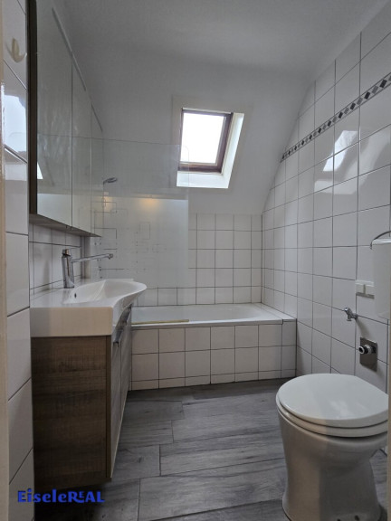 - Badezimmer mit Fenster, Wanne, Waschbecken, WM-Anschluss und WC