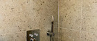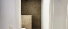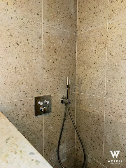 Modernes Badezimmer mit WC – ausgestattet mit Villeroy & Boch Sanitär, einer hochwertigen Dusche samt Regendusche sowie eleganter WOW-Verfliesung.