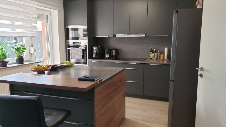 Eine hochwertige Einbauküche mit Speis und Essplatz, einen großzügigen Wohnsalon mit direktem Ausgang auf eine 15 m² überdachte und windgeschützte Terrasse. Im Obergeschoss noch eine weitere 23 m² große Terrasse mit Panoramablick über die Stadt.