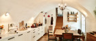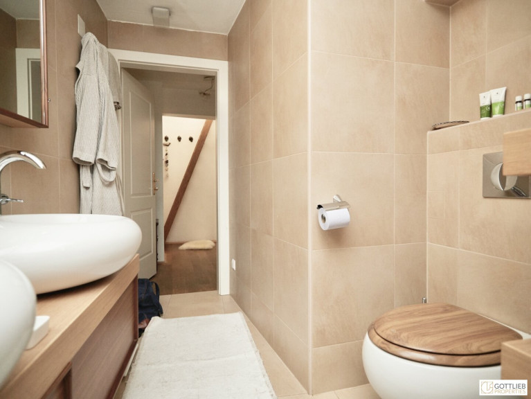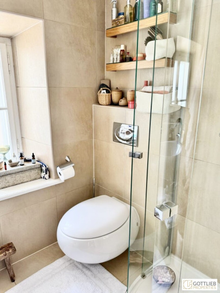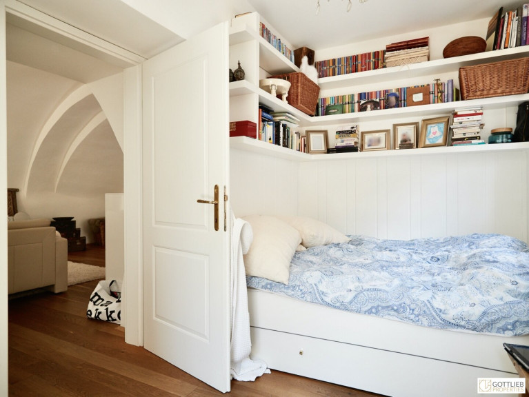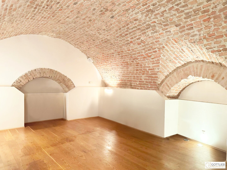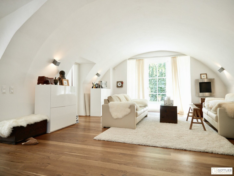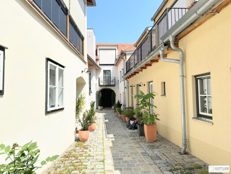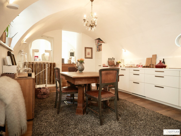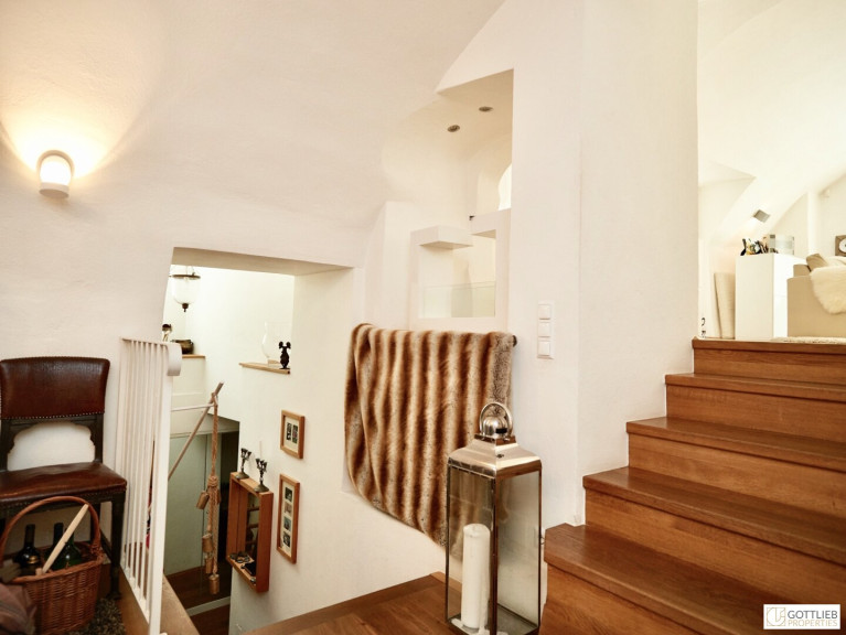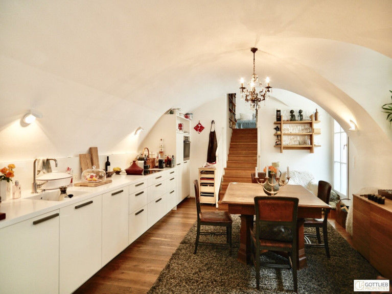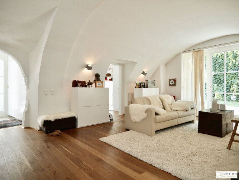 Diese außergewöhnliche, zweigeschossige Garten-Wohnung mit ca. 165 m² Wohnnutzfläche ist süd- und ostseitig ausgerichtet und beinhaltet drei helle, geräumige Zimmer - eines davon mit direktem Ausgang in den ca. 63 m² großen Eigengarten, welcher Teil des malerischen Innenhofes ist. Über Stufen gelangt man vom Wohnzimmer in die offene, gemütliche Wohnküche mit Essplatz. Beide Räume sind mit einem historischen, sogenannten Tonnengewölbe gedeckt - welches den Charme sowie das Flair der Geschichte dieses Hauses widerspiegelt. Eines der Schlafzimmer hat eine kleine zusätzliche Galerie, einen Schrankraum und ein angeschlossenes Duschbad mit Toilette. Ein Vorraum komplettiert das Erdgeschoss.