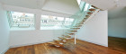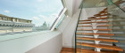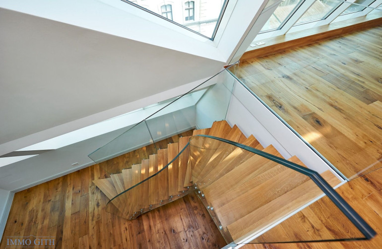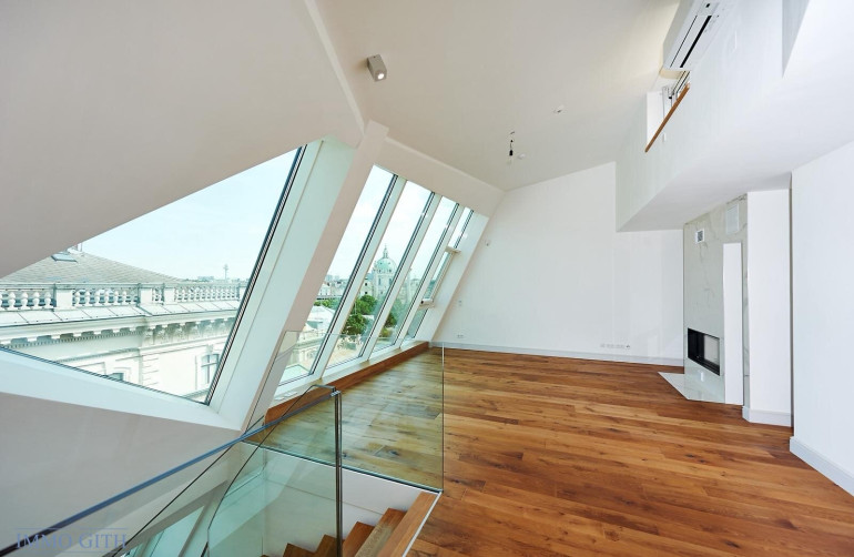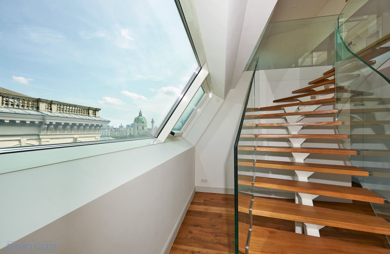 Der Dachgeschoßausbau wurde über drei Ebenen realisiert. Besonders hervorzuheben sind die großflächigen Panoramaverglasungen, die einen freien Blick über den Karlsplatz und die Stadt ermöglichen, sowie die konsequent in den Wohnalltag integrierten Terrassenlandschaften.