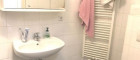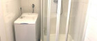 Badezimmer mit Duschkabine, Waschbecken, Handtuchradiator, Waschmaschine und WC