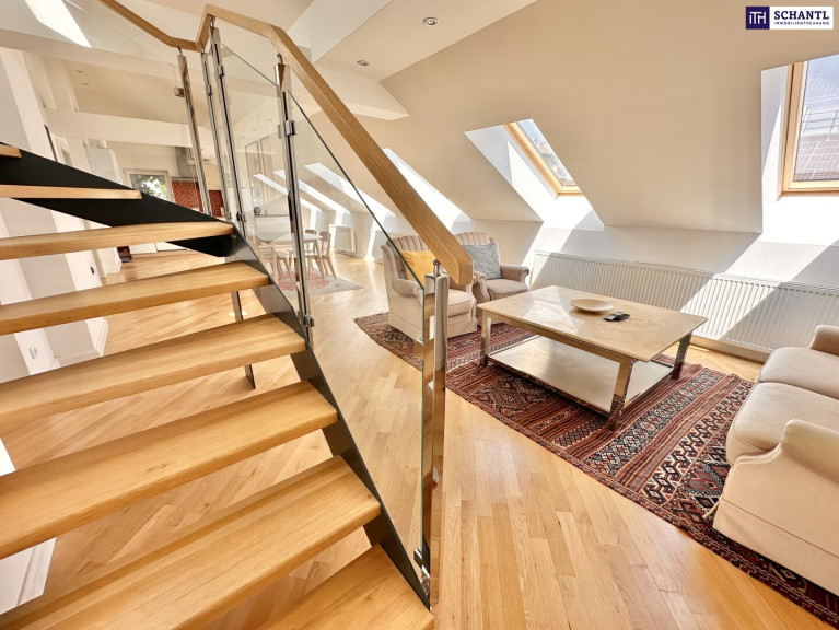 Das Dachgeschoss verfügt bereits über einen direkten Liftzugang sowie einen Zugang über das Stiegenhaus; ein weiterer separater Zugang über das bestehende Stiegenhaus ließe sich bei Bedarf unkompliziert realisieren –– eine architektonisch elegante Möglichkeit, die Einheit bei Bedarf in zwei separate Wohnungen zu teilen