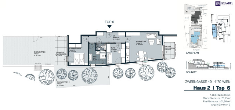 Mit 75,21 m² Wohnfläche und einem besonders intelligenten Grundriss bietet Top 6 ein Zuhause für alle, die großzügiges Wohnen mit einem Maximum an Lebensqualität verbinden möchten. Das Schlafzimmer grenzt direkt an Terrasse und Garten, während sich der lichtdurchflutete Wohnbereich weit zum Balkon und in den zweiten Garten öffnet – ein idealer Rückzugsort mit außergewöhnlichem Ausblick ins Grüne.