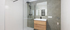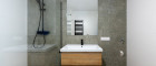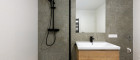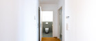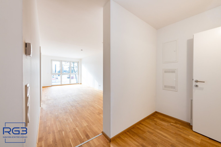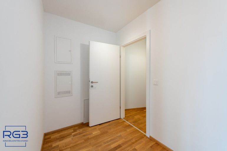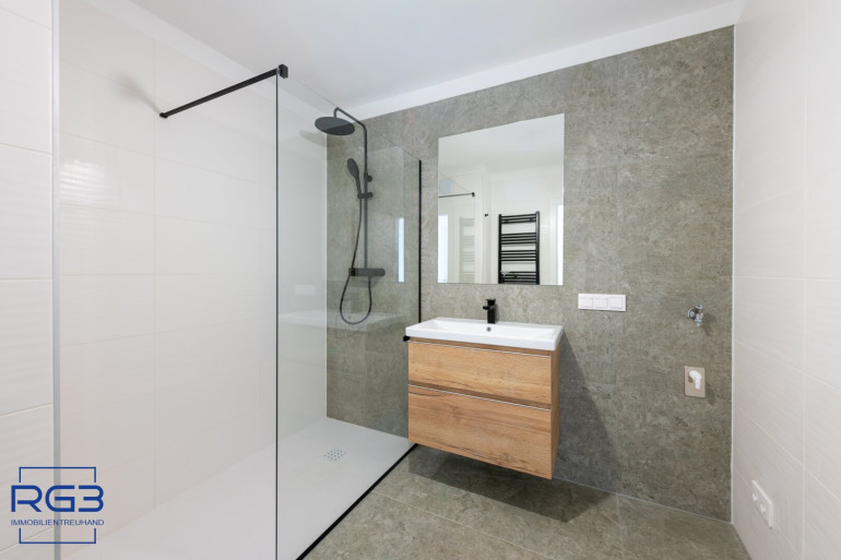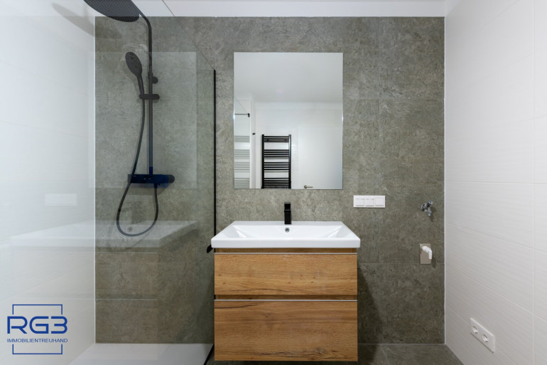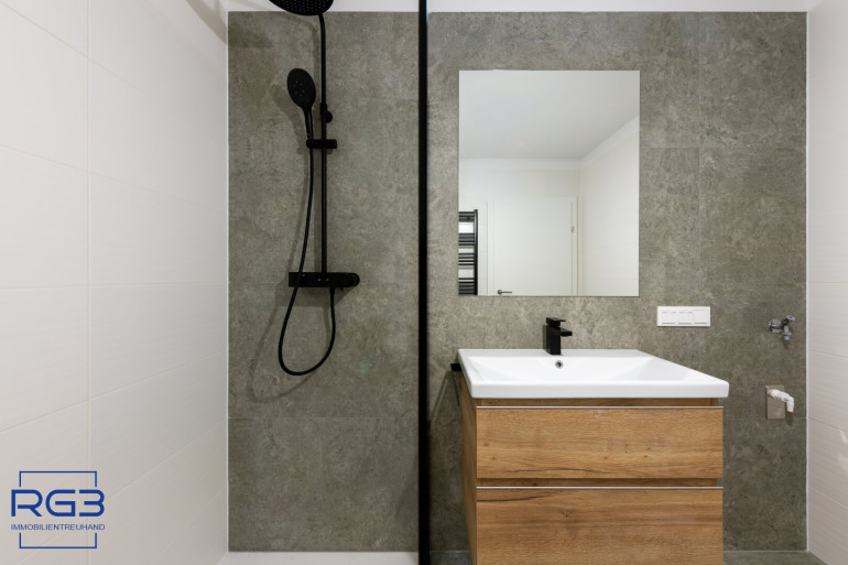 Mit dem Lift fahren Sie bequem in den ersten Stock. Sie betreten die Wohnung und spüren sofort: alles ist neu, alles ist ruhig, alles passt zusammen. Rechts befindet sich ausreichend Platz für Garderobe und Jacken. Links liegt das moderne Badezimmer mit extra Toilette, klar gestaltet, hochwertig ausgeführt.