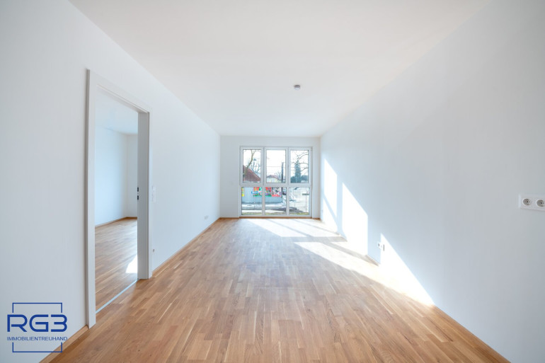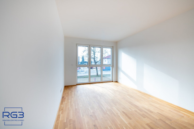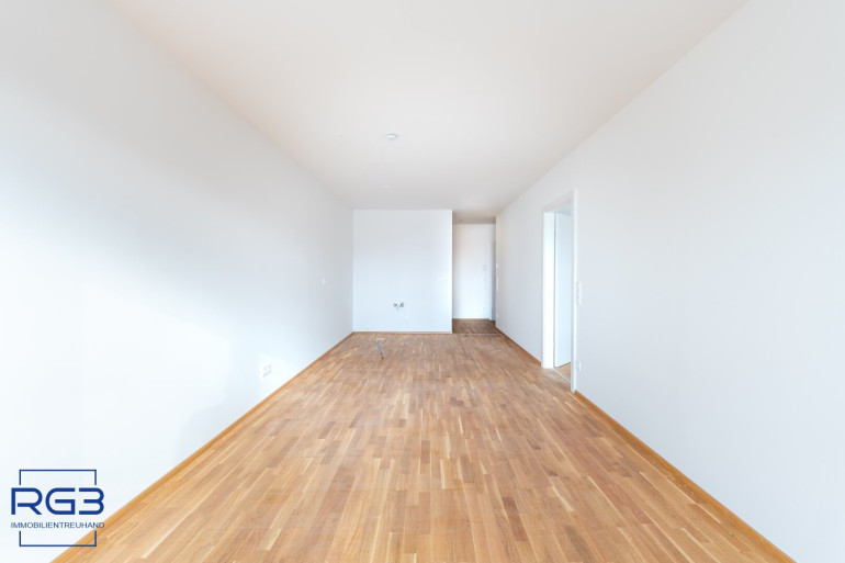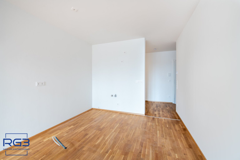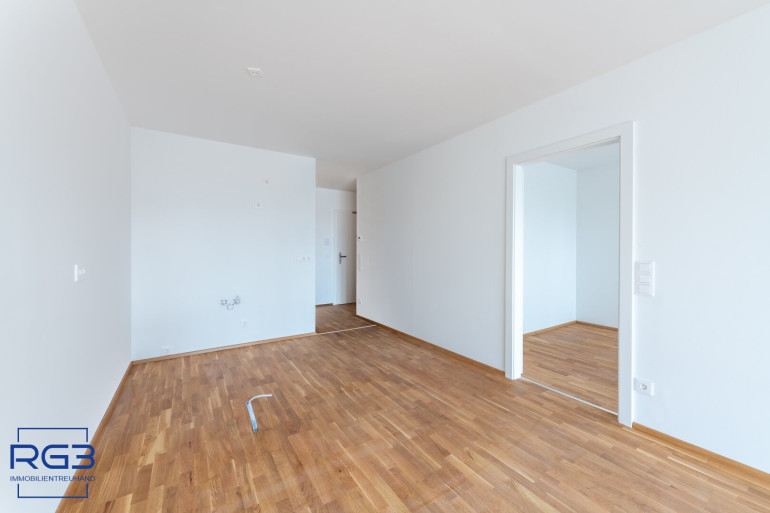 Geradeaus öffnet sich der Wohnbereich. Hier geht der Küchenraum fließend in das großzügige Wohnzimmer über. Der Raum ist angenehm geplant, hell und sehr gut möblierbar. Vom Schlafzimmer gelangen Sie direkt auf die Loggia mit einem wunderbaren Blick in den Südwesten Richtung Alte Donau, zu der Sie nur ca. 170m Gehweg haben.