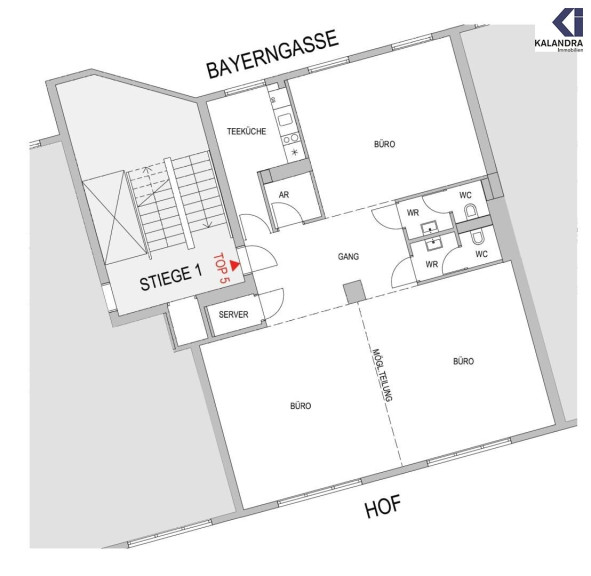 zentraler Vorraum, Grossraumbüro, zwei weitere Zimmer, 2 WCs, Abstellraum,