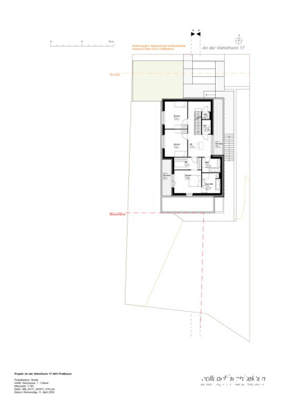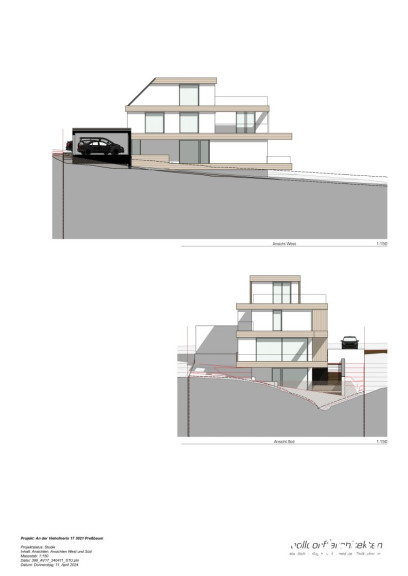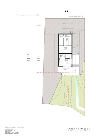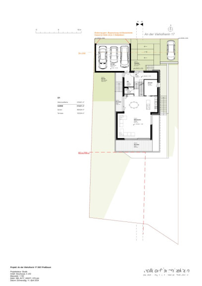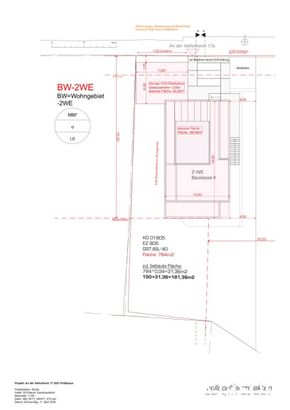Eine unverbindliche Bebauungsstudie für ein Haus mit 2 Wohneinheiten wurde für das Grundstück erstellt. Die geplante Wohneinheit 1 verfügt über eine Wohnnutzfläche von ca. 316,81 m², eine Gartenfläche von ca. 484,84 m², eine Terrassenflächen von insgesamt ca. 102,84 m². Die geplante Wohneinheit 2 verfügt über eine Wohnnutzfläche von ca. 31,31m² und einen Garten/Zugang von ca. 73m². Weiters wurden 4 Autoabstellplätzen geplant.