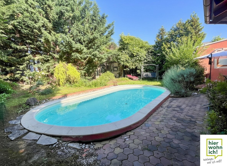 Ihre private Bade-Oase: Eingebettet, fast wie bei einer Waldlichtung, bildet der Pool mit einer Größe von 7,37 x 3,60 das Herzstück des Gartens und bietet herrliche Abkühlung an heißen Sommertagen-hier genießen Sie den Sommer in vollen Zügen.