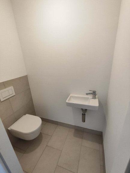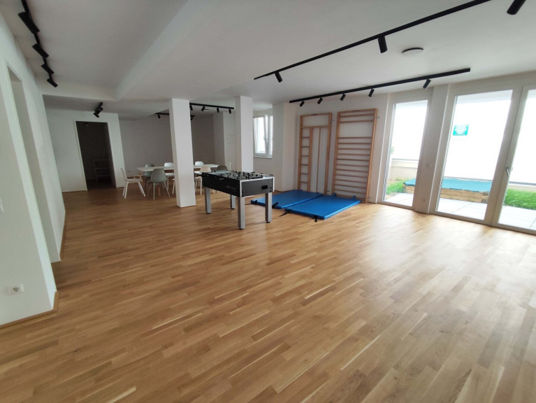 Räumlichkeiten: Vorraum (ca. 2,5 m²), Abstellraum (ca. 2 m²), extra WC, Wohnküche (ca. 32 m²) mit Zugang zur Terrasse, 1. Zimmer (ca. 16 m²) mit eigenem Badezimmer und Zugang zum Balkon, 1. Badezimmer (ca. 5,5 m²) mit Badewanne, Handwaschbecken, Toilette und Waschmaschinenanschluss, 2. Zimmer (ca. 12 m²) mit eigenem Badezimmer, 2. Badezimmer (ca. 3 m²) mit Dusche und Handwaschbecken
