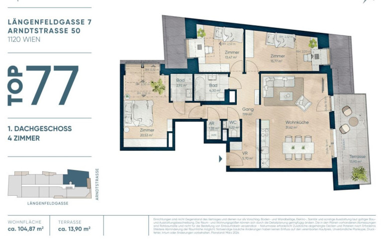 Wohnungsbeschreibung Top 77 im 1. DG mit 104,87 m2 Wohnfläche + Terrasse: