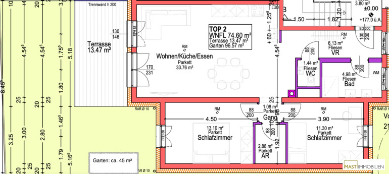 Nach Eintritt in die Wohnung gelangen Sie in ein großzügiges Vorzimmer / Eingangsbereich das ich Ihnen ausreichend Platz für Ihre Garderobe bietet. Das Badezimmer das mit einer Badewanne, WM-Anschluss & Waschbecken ausgestattet ist, verfügt über Fenster. Das separate WC natürlich inkl. Handwaschbecken. Die Wohnküche wurde mit einer hochwertigen Küche der Marke EWE ausgestattet. Beide Schlafräume sind ca. 12 m² groß und bieten ausreichend Möglichkeiten. Die Terrasse mit ca. 13 m² & der Eigengarten mit ca. 45 m² ist vom Wohnzimmer aus begehbar und hofseitig ausgerichtet.