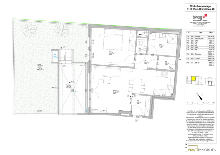Die Wohnung befindet sich im Erdgeschoss und verfügt über 56,34 m² Wohnfläche + eine 13,06 m² große Terrasse + ein 48,43 m² großer Garten.