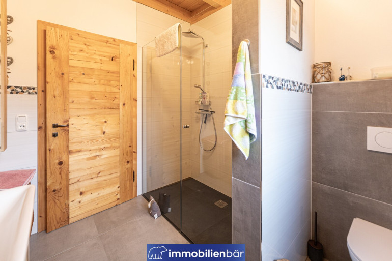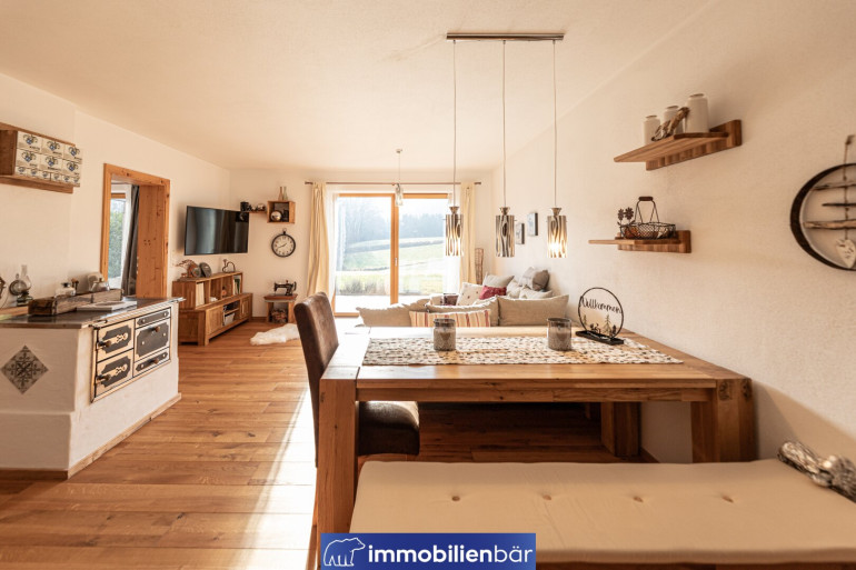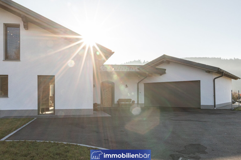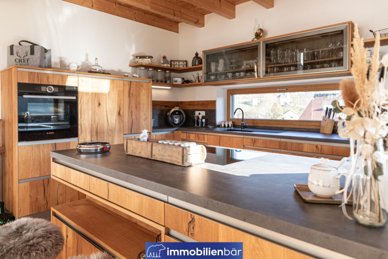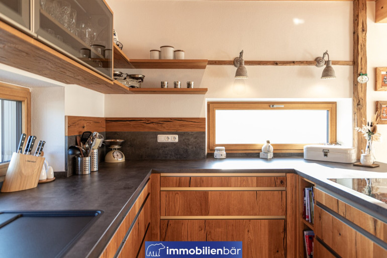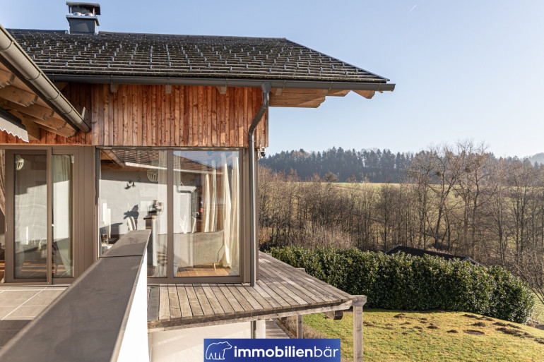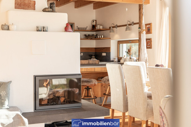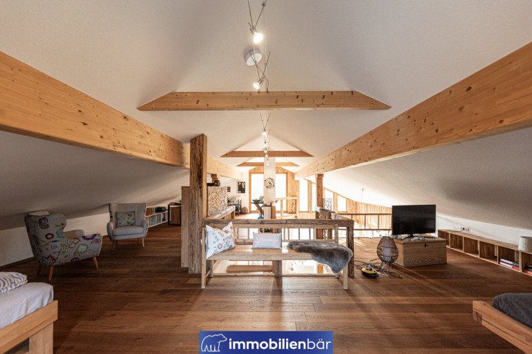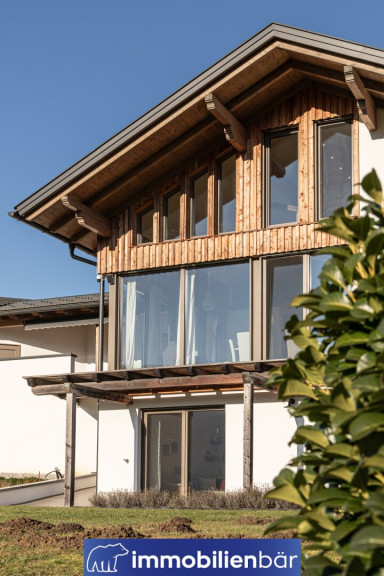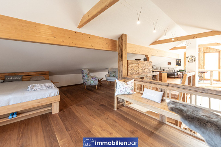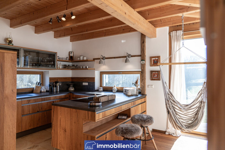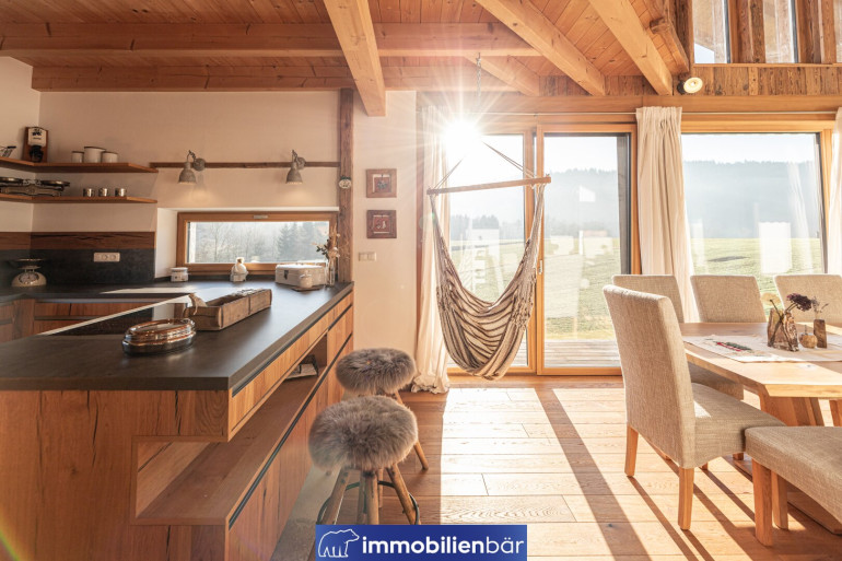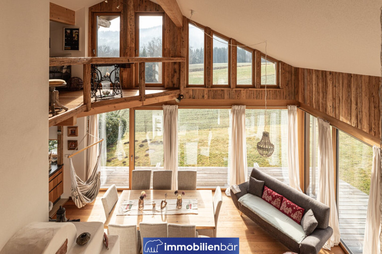 Natürliche Materialien, warme bis urige Holzelemente und eine behagliche Architektur prägen das einladende Landhaus. Große Fenster holen Licht und die traumhafte Landschaft in die Wohnräume. Ein Highlight: Die offene Gestaltung mit Galerie schafft Weite und Wohnkomfort. Gemütlich und gleichzeitig hochwertig zieht sich der Chaletstil durch alle Räume und verleiht dem Haus seinen ganz individuellen Wohlfühlcharakter.