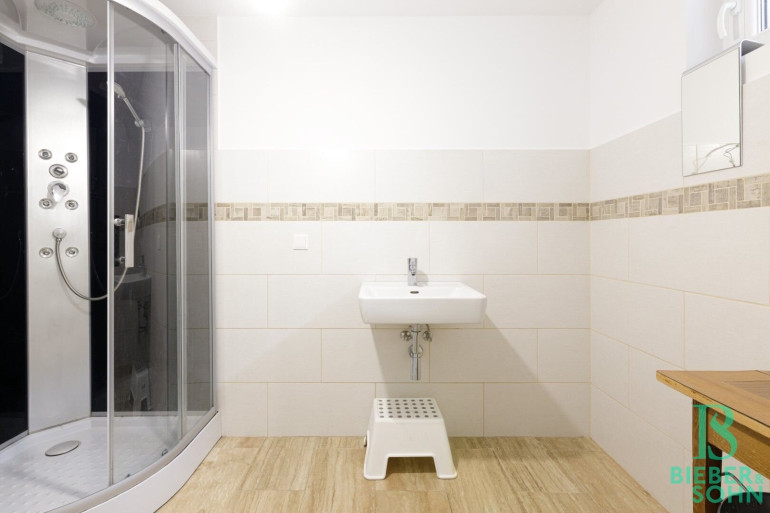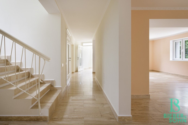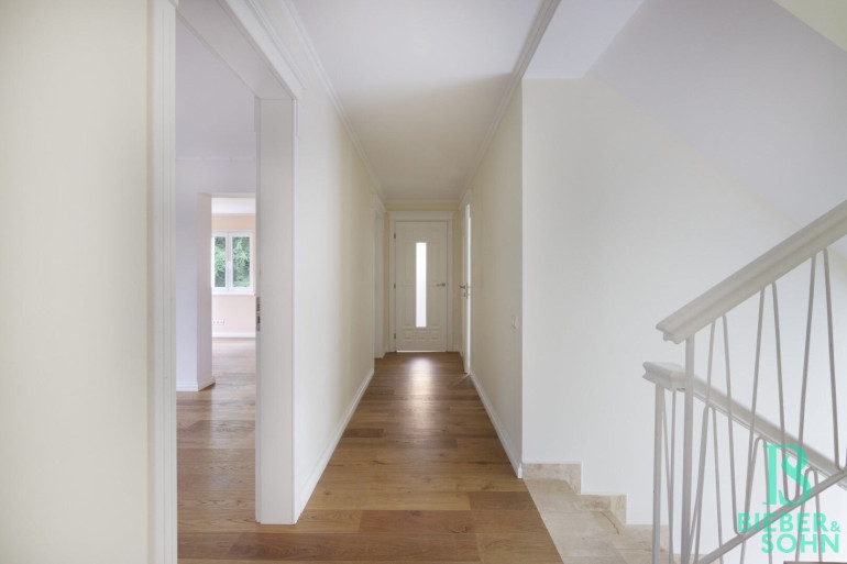 Die offen gehaltene Stiege führt in den 1. Stock, der mit wunderschönen Parkettböden ausgelegt ist und über drei Zimmer, einem Abstellraum und einem luxuriösen Bad mit Wanne, walk-in-Dusche und einem separaten WC ausgestattet ist.