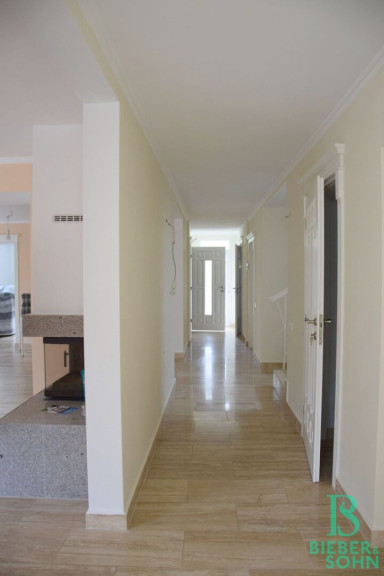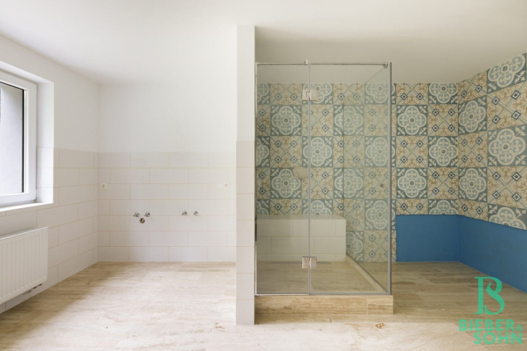Das Erdgeschoss, welches über einen Windfang zu betreten ist, mit seinem loftartigen Charakter und dem verglasten Kamin im Wohnraum, verleiht ein angenehmes, wohliges Wohngefühl, denn der Wohnraum geht in den Essraum nahtlos über sowie in die angrenzende Küche und lässt rundum den Blick ins Grüne frei! Vom Flur aus sind das Duschbad, Ankleideraum, Heizraum und das separate WC zu begehen. Edler Steinboden mit Fußbodenheizung und elegante Stuckleisten, Mehrfachverglasung, runden diesen Bereich ab!
