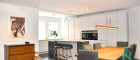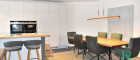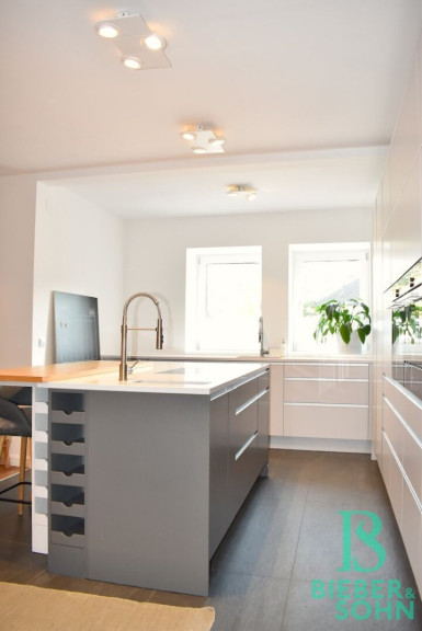 Bereits beim Betreten des Hauses empfängt einen ein einladender Eingangsbereich, der in den weitläufigen Wohn-Essbereich führt. Hier eröffnet sich das beeindruckende Raumgefühl mit der offenen Design-Küche, die mit Allem ausgestattet ist, was das Gourmetherz begehrt.
