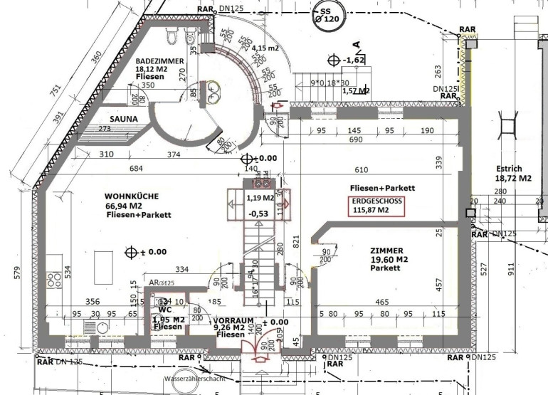 Im Erdgeschoss befinden sich zudem zwei weitere weitläufige, helle Räume mit individuellen Gestaltungsmöglichkeiten, der Ausgang auf die große Terrasse und in den gepflegten Garten sowie ein Abstellraum. Ebenfalls auf dieser Ebene überrascht ein XL-Erlebnisrundduschbad mit WC und Bidet, Garderobe sowie bodentiefer Fensterfronten.