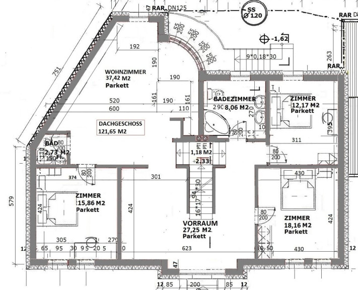 Über einige weitere Stufen gelangt man in die geräumige Dachgeschossebene mit den zwei hellen, je ca. 35m² großzügigen Mansardenzimmern mit viel Nutzungspotential.