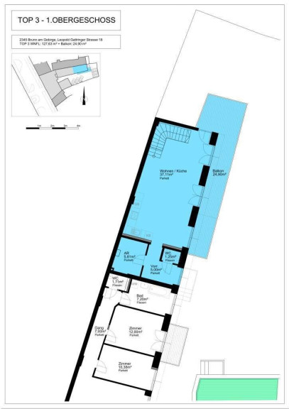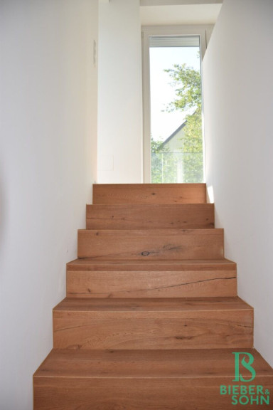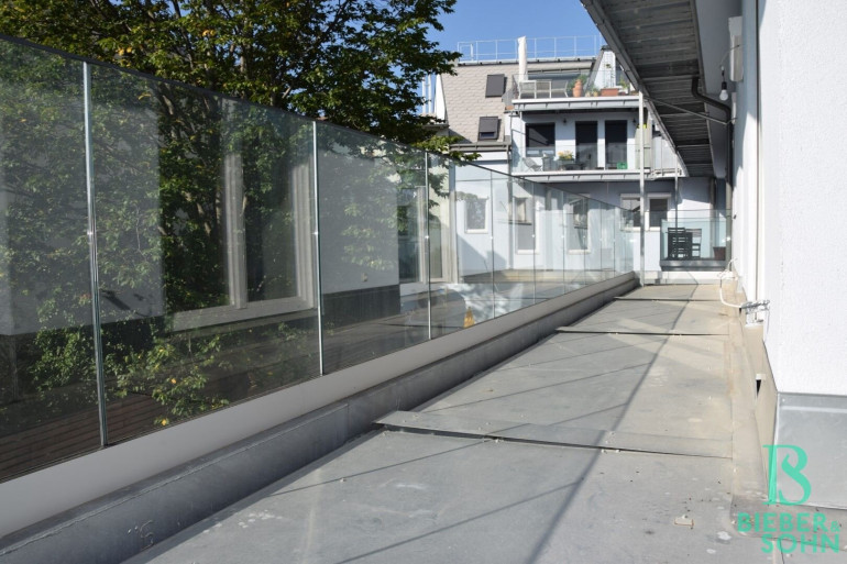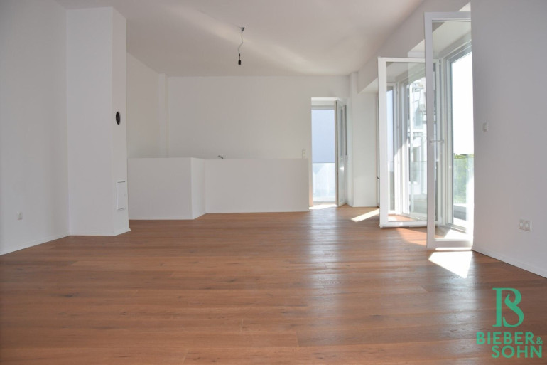In das Obergeschoß führt eine schöne Stiege und es eröffnet sich ein großzügiger, sonniger Wohnraum mit Ausgang auf den ca. 25m² großen, verglasten Balkon. Das gut durchdachte Raumkonzept ermöglicht es, dass eine offen gehalten Küche (nur Anschlüsse vorhanden) sich bestens in den Wohnraum integriert. Auf dieser Ebene sind außerdem ein Abstellraum und ein Gäste-WC vorzufinden.