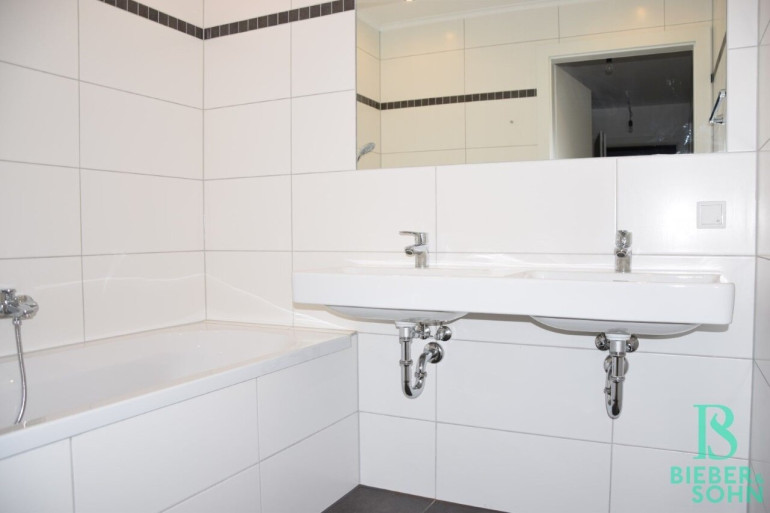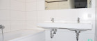 Das Bad ist deckenhoch verfliest, mit Badewanne, Doppelwaschtisch.