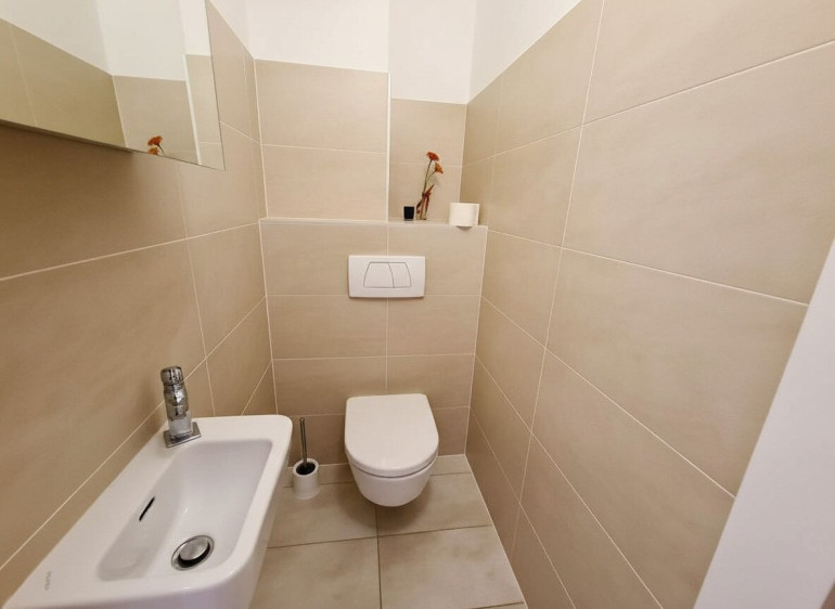 Der Zugang erfolgt über eine rund 14 m² große Terrasse in den ruhigen Innenhof. Das großzügige Vorzimmer bietet ausreichend Platz für Garderobe und Stauraum.