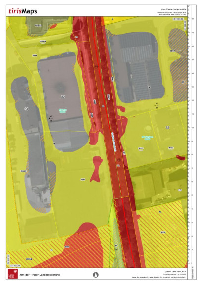 Die Grundstücke Nr. 2594 (2.521 m²), Nr. 2595 (115 m²) und Nr. 2597 (3.280 m²) sind als Allgemeines Mischgebiet gewidmet und erlauben somit sowohl Betriebsgebäude als auch Gebäude für Wohn- oder Mischzwecke. Das Grundstück Nr. 2596 (460 m²) ist als Freiland ausgewiesen.