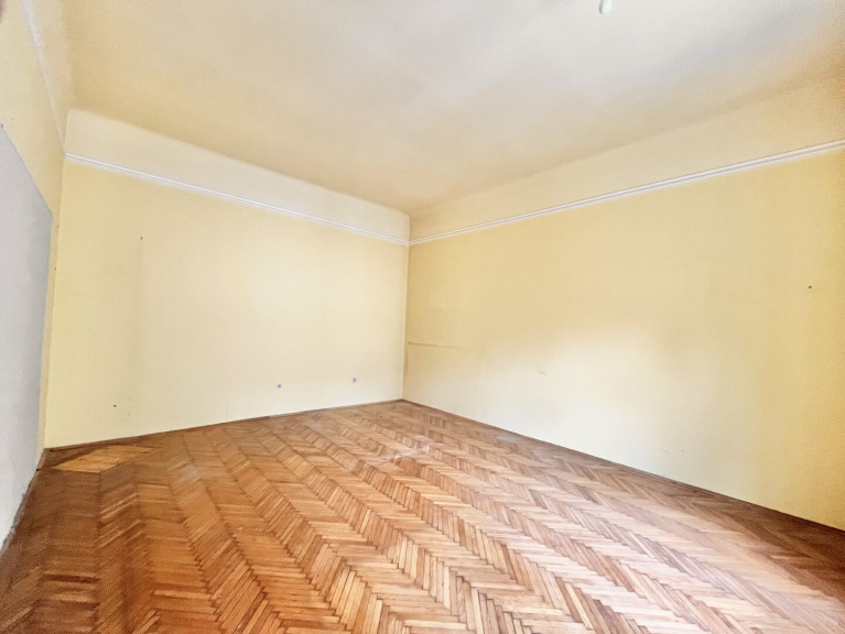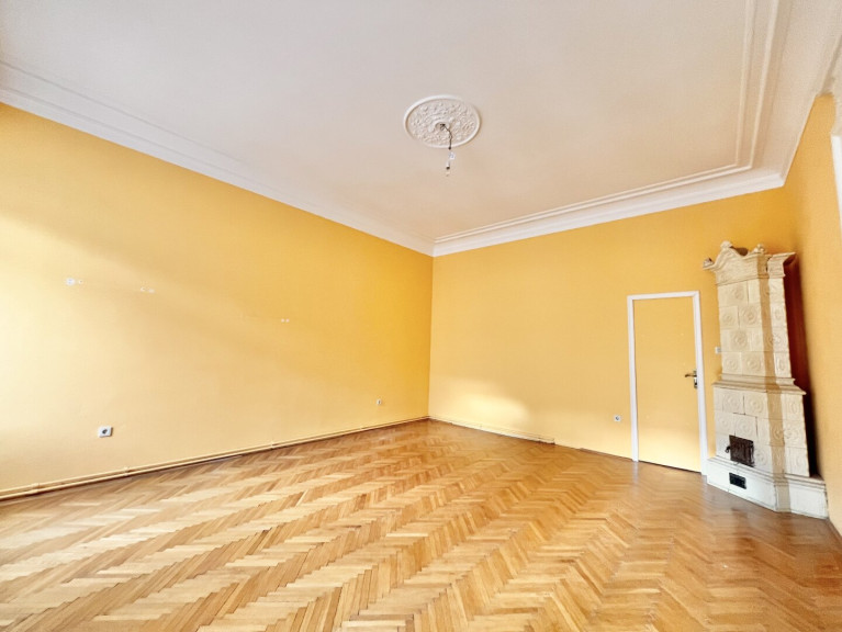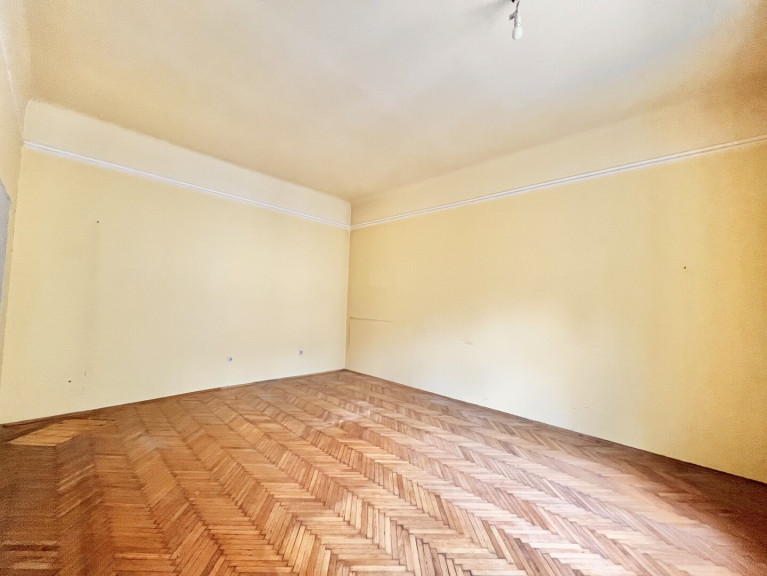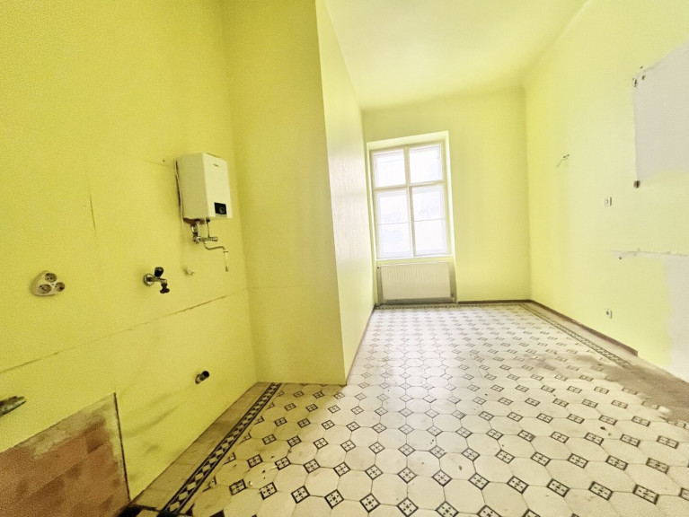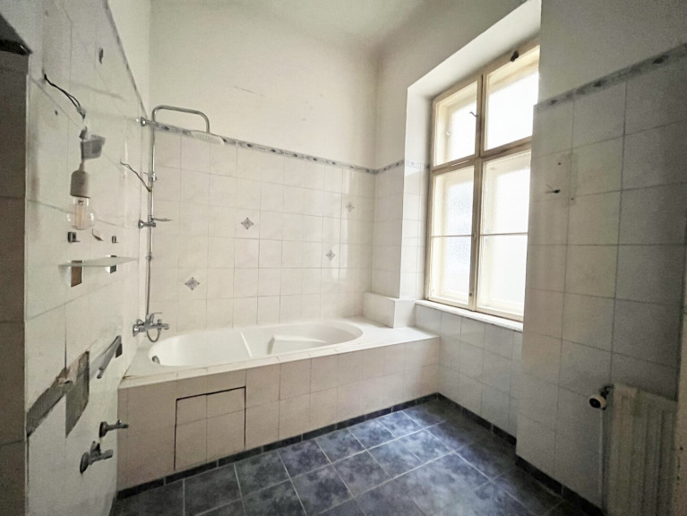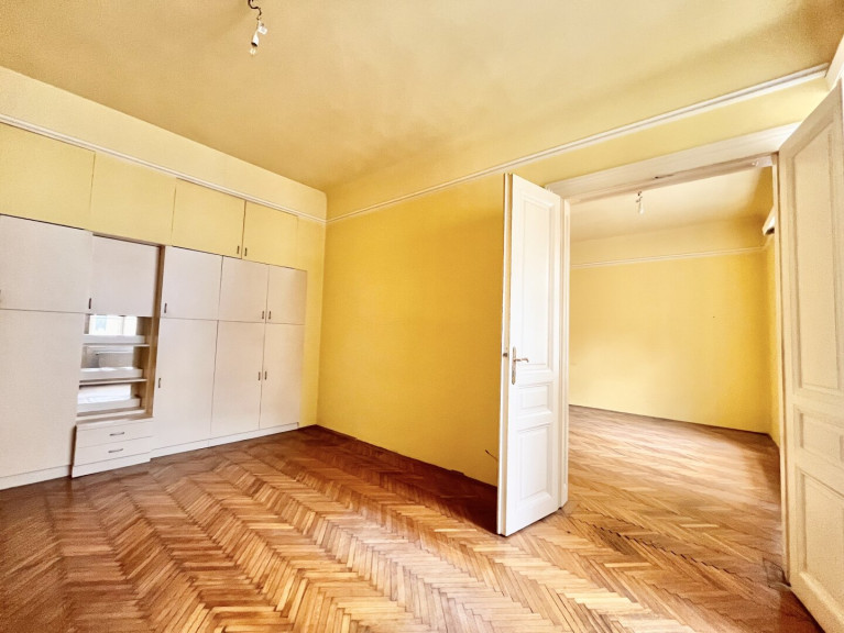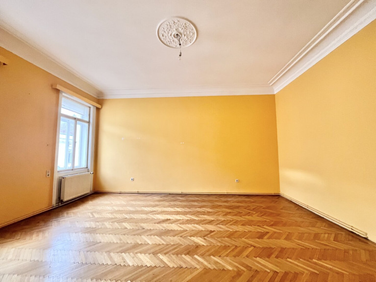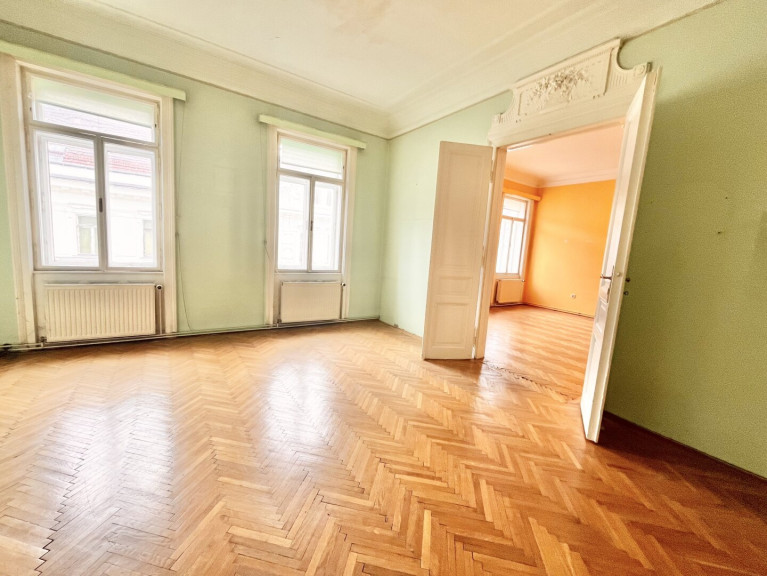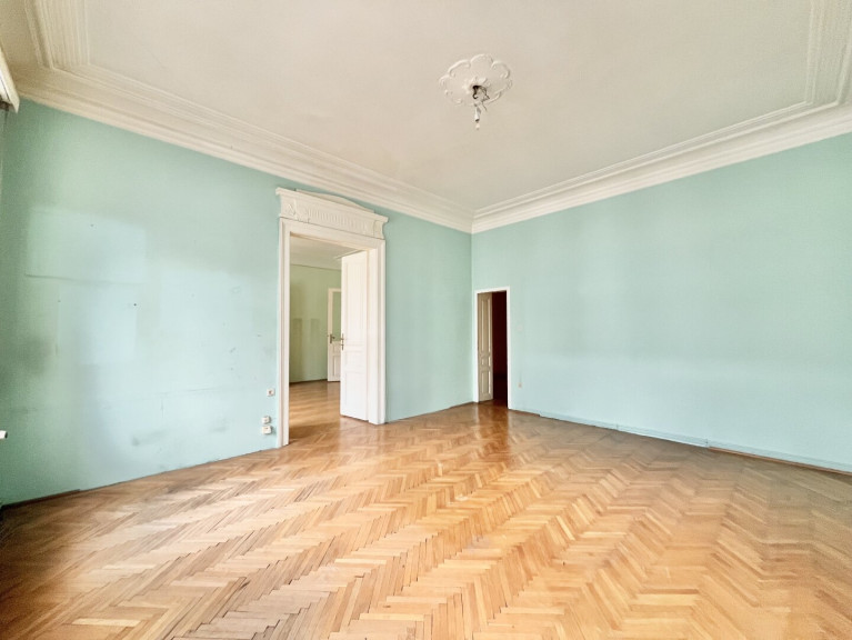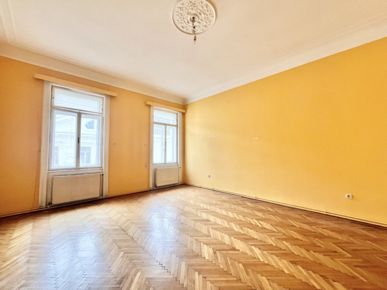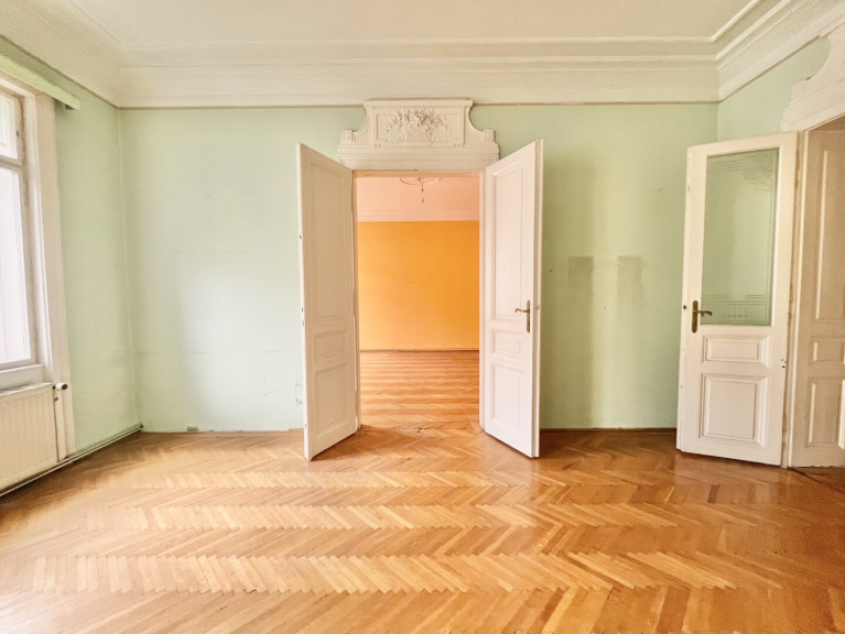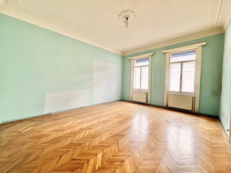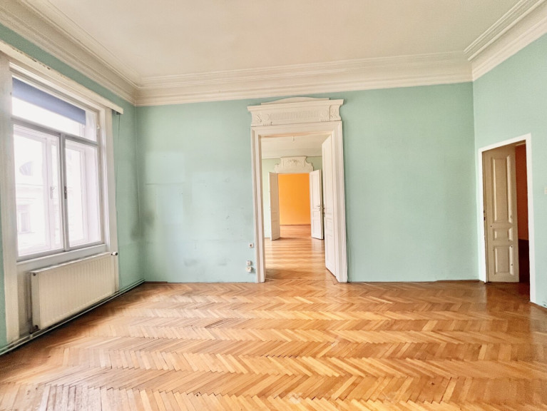 Die Fläche wurde zuvor als Wohnung genutzt und ist in einem sanierungsbedürftigen Zustand, der gleichzeitig eine flexible und individuelle Nutzung ermöglicht. Hochwertiger Parkettboden, doppelflügelige Türen und originale Stuckdecken bilden eine solide Grundlage für die Umgestaltung zu modernen Büroarbeitsbereichen.