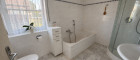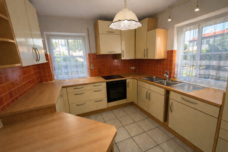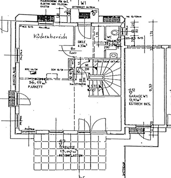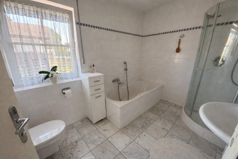 Fliesen, Parkett, Gas, Zentralheizung, Einbauküche, Bad mit Fenster, Badewanne, Dusche, Garage
