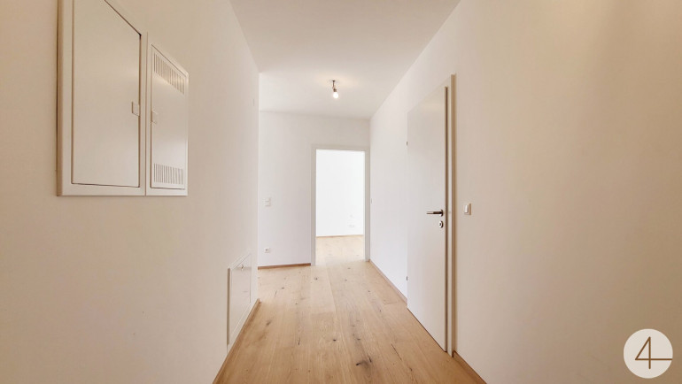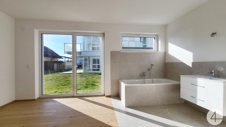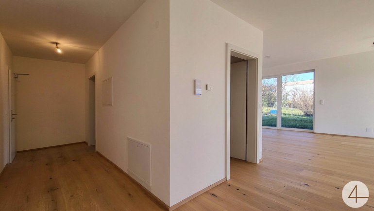 Die Neubauwohnung liegt im Erdgeschoß eines 4 Parteienhauses und bietet 2 zentral begehbaren Schlafzimmer – einen großen offener Wohn-Ess-Küchenbereich mit großen Terrassentüren und Fenstern ausgestattet.