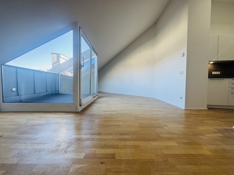 Modern geschnittene Dachgeschosswohnung mit privater Dachterrasse. Lichtdurchflutete Räume durch die Dachfenster, offene Wohn-/Esszone mit direktem Zugang zur Terrasse — ideal zum Entspannen.