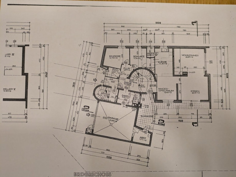 Erdgeschoss: Garage - Abstellraum - Garderobe - WCs - Terrasse - Badezimmer - Kinderzimmer - Schlafzimmer - Küche - Kinderspielraum - Esszimmer - Wohnzimmer - Flur