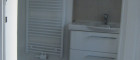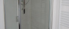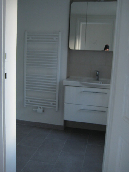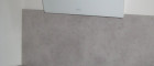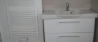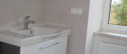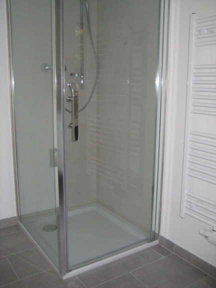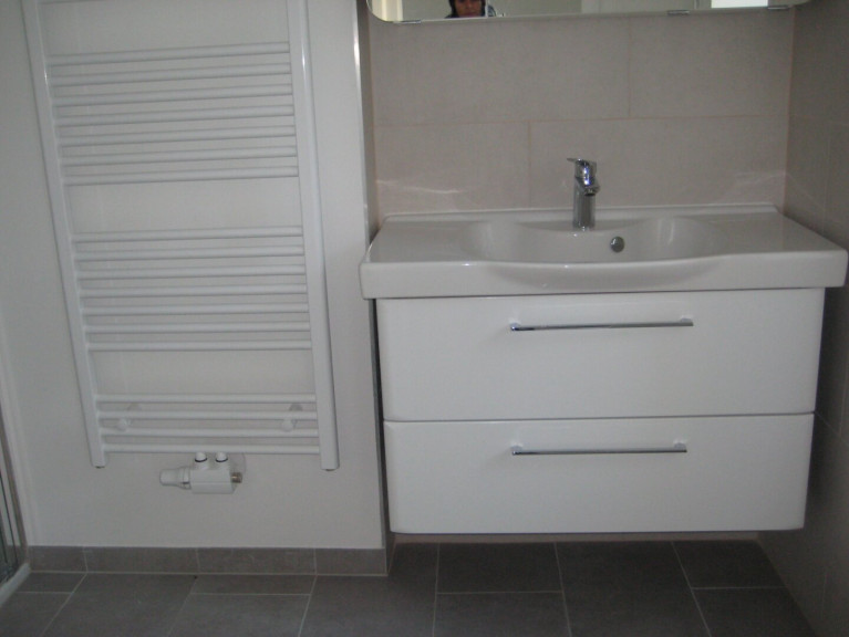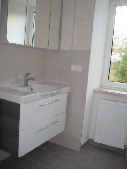 Badezimmer: moderne Dusche mit Glaswand, Waschmaschinenanschluss, Waschbecken mit Spiegelschrank, Unterbau