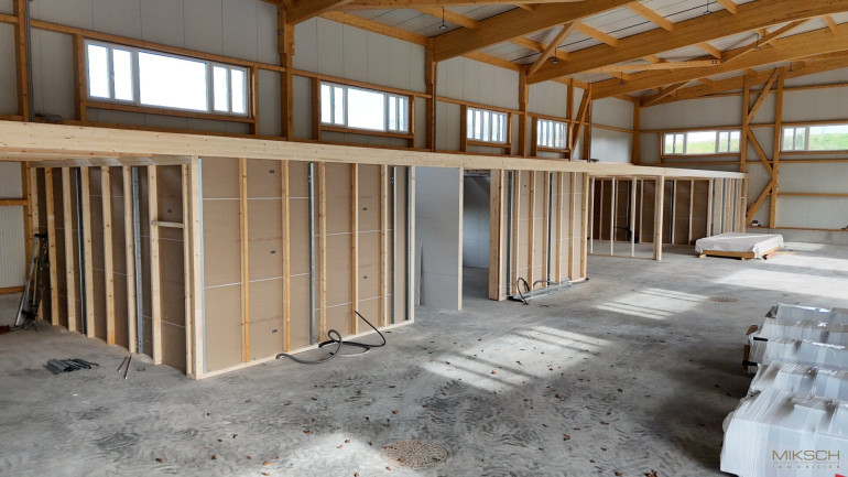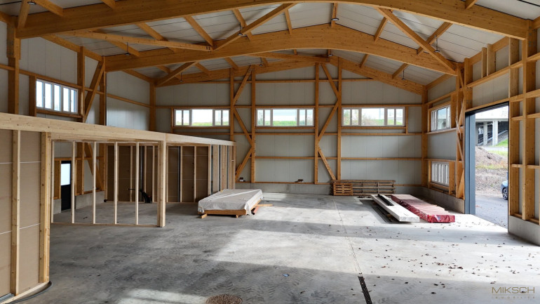 Die moderne Gewerbehalle wurde in fünf voneinander getrennte Brandabschnitte (Einstellbereiche 1–5) unterteilt, wodurch jeder Abschnitt autark genutzt werden kann. Massive Bauweise, hochwertige Paneelverkleidung mit Steinwolldämmung und ein asymmetrisches Satteldach mit optimaler Belichtung sorgen für ein sicheres, effizientes und angenehmes Arbeitsumfeld.