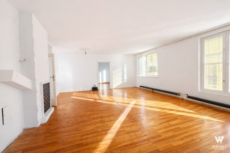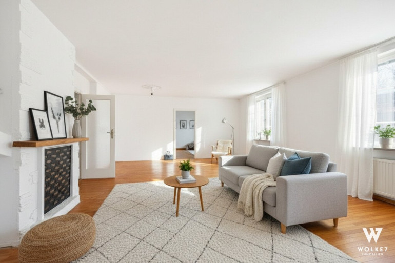 Die Wohnung wurde frisch ausgemalt und präsentiert sich in einem sehr gepflegten Zustand. Dank der ostseitigen Ausrichtung ist sie besonders sonnig und lichtdurchflutet. Das großzügige Wohnzimmer mit ca. 46 m² bietet viel Platz für Wohnen und Essen und verfügt über die Möglichkeit zum Einbau eines offenen Kamins.