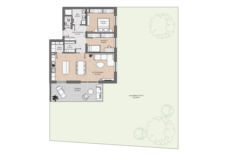 Die Wohnung Top 2 befindet sich im Erdgeschoss, ist nach Süd-Osten ausgerichtet und weist folgende räumliche Aufteilung auf: