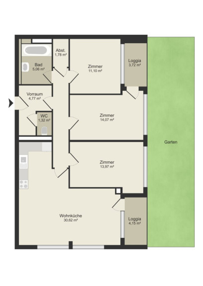 Großzügige Wohnküche ca. 30,62 m² mit direktem Zugang zur Loggia und zum Garten