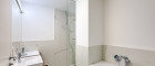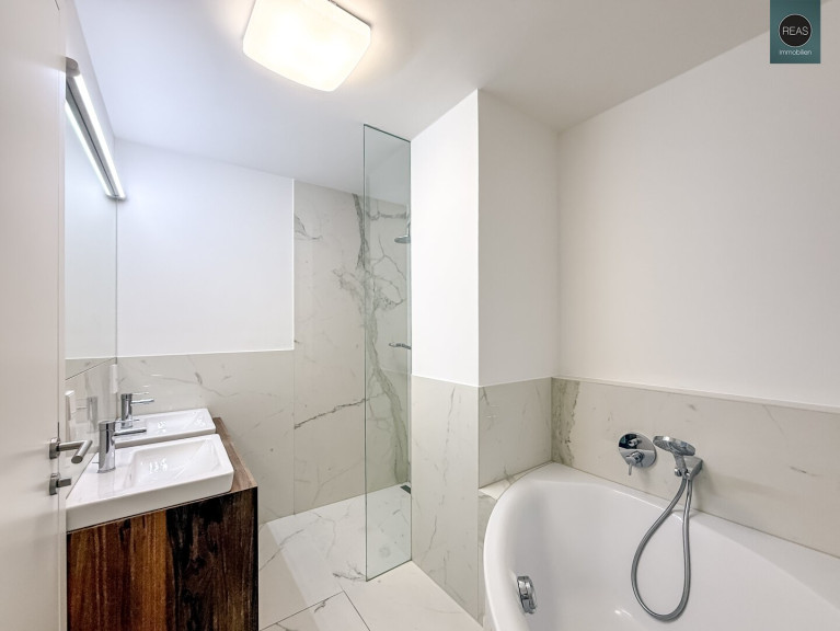 - 1 Bad mit WC, Dusche samt Glaswand, Doppelwaschbecken, Spiegel samt Beleuchtung, Waschmaschine
