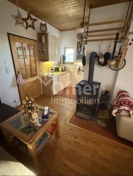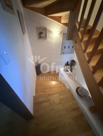 Die Wohnfläche von ca. 105 m² bietet im Erdgeschoß einen einladenden Vorraum, ein Schlafzimmer, ein modernes Badezimmer mit Dusche und WC, sowie eine praktische Speisekammer. Über die hochwertige Lerchenstiege gelangen Sie ins erste Obergeschoß bestehend aus einer praktikablen Küche, einer offenen Wohnstube mit Kaminofen, zusätzlichem WC und Zugang zum Balkon.