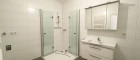 Das Badezimmer ist modern verfliest und mit einer bodenebenen Dusche, einem Handwaschbecken, einem Handtuchheizkörper und einem Waschmaschinenanschluss ausgestattet.