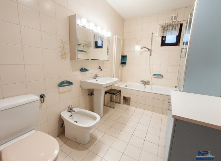 Das Untergeschoss umfasst zwei Kellerräume, die Ihnen zusätzlichen Stauraum bieten. Zudem gibt es zwei Schlafzimmer, von denen eines, direkten Zugang zum Garten. Ein weiteres Badezimmer mit Wanne, Dusche, WC und Bidet sorgt für zusätzlichen Komfort.