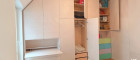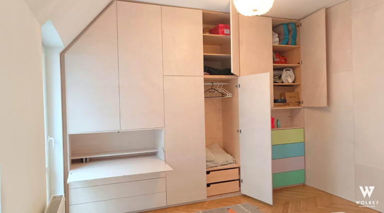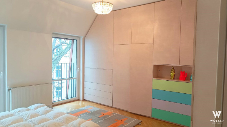 Im Schlafzimmer wurde vom Tischler ein hochwertiger Echtholz-Einbauschrank maßgefertigt integriert. Dieser bietet großzügigen Stauraum und verfügt über einen clever versteckten Sekretär – funktional und ästhetisch zugleich.