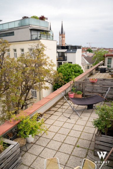 Ein absolutes Highlight ist die direkt über der Wohnung liegende Dachterrasse – ein privater Rückzugsort über den Dächern Wiens. Von hier aus genießen Sie Sonne, Ruhe und sogar einen Blick auf den Stephansdom – eine seltene Kombination aus Urbanität und Privatsphäre.
