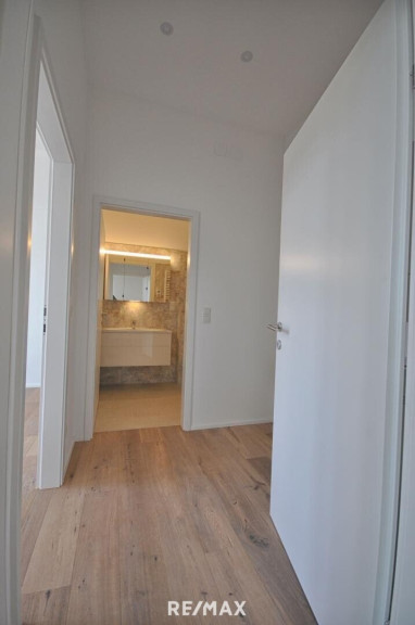 Durch das Vorzimmer, in welchem sich einer von 2 kleinen Balkonen befindet, gelangt man in das Wohnzimmer mit Weitblick.