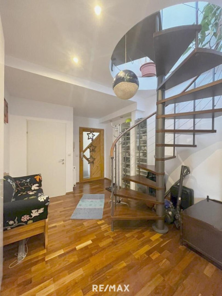 Beim Betreten der Wohnung empfängt Sie ein geräumiger Vorraum, der mit einer eleganten Wendeltreppe zur oberen Galerie führt. Diese Galerie wird derzeit von der Eigentümerin als Büro genutzt und bietet Zugang zu einer ca. 17 m² großen Terrasse. Hier können Sie entspannen und den atemberaubenden Rundumblick genießen – besonders hervorzuheben ist der Blick auf die Gloriette, der Ihnen täglich Freude bereiten wird.