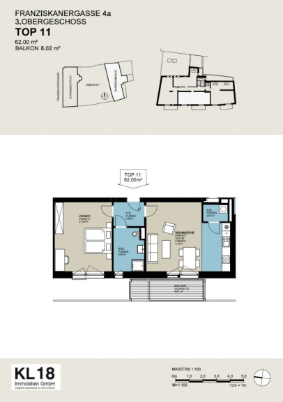 Vorraum, Wohnraum inkl. Küche, Schlafzimmer, Badezimmer mit WC, Abstellraum und Balkon.
