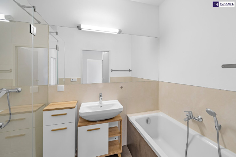 Zwei ruhig gelegene Zimmer bieten klare Rückzugsbereiche, ergänzt durch einen separaten Schrankraum, der Stauraum schafft, ohne Wohnfläche zu verschwenden. Bad und WC sind getrennt, der Vorraum effizient und logisch geplant.
